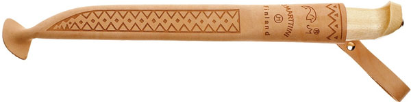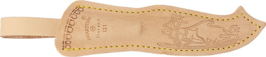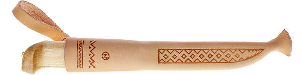 A traditional Lynx knife with a longer blade. This knife has a 13 cm long blade of stainless chrome steel featuring the traditional upturned point. The handle is of curly birch, and the leather sheath features traditional Lappish scenes.